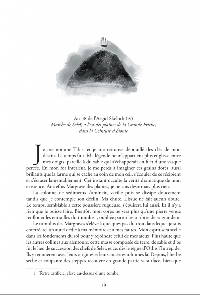 À travers ces quatre nouvelles qui forment ce roman, vous suivrez le destin d’hommes et de femmes sur trois périodes, inspirées de l’âge de bronze jusqu’à l’antiquité. Prenez part au conflit qui couvre de sang les steppes de la Grande Friche, où une guerre fratricide déchire les peuples séléens et vhelens. Qui des guerriers hyènes nomades ou des soldats du Margrave régneront sur ces terres abandonnées des dieux ? Entre conflits religieux et belliqueux, vengeance et sacrifice, sorcellerie et alchimie, nul n’échappera aux trahisons et aux charognards.